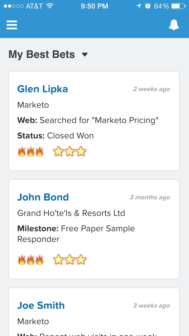 Seus recursos favoritos do Sales Insight - lead feed, melhores opções, momentos interessantes e adicionar ao Marketo Campaign - todos disponíveis no aplicativo Salesforce1.