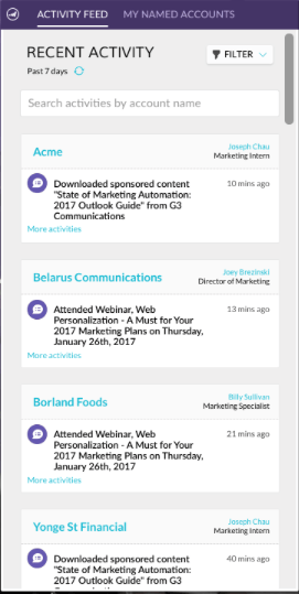 O Account Insight é um plug-in do Google Chrome que exibe ABM acionável e insights de conta para suas equipes de vendas, permitindo que elas trabalhem em conjunto com o marketing para envolver contas de maneira eficaz. As equipes de vendas terão visibilidade dos dados e insights gerados para cada uma das contas nomeadas que possuem. Isso incluirá percentis de pontuação da conta, uma lista priorizada de suas contas nomeadas, pessoas engajadas nessas contas e um fluxo de atividades online de atividades recentes da conta.