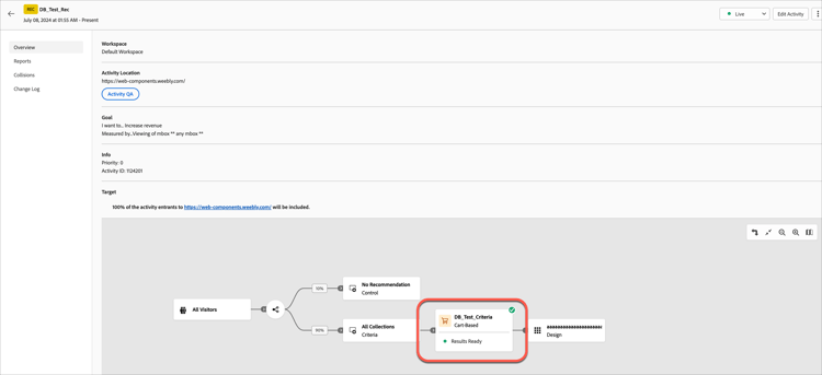 Depois que o algoritmo tiver os resultados prontos, você poderá visualizar esses resultados usando a funcionalidade Link de controle de qualidade de Adobe Target. Os links de controle de qualidade estão disponíveis na seção Activity Location da página de visão geral Activity: