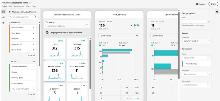 O aplicativo Painéis do Adobe Analytics e o Cartão de pontuação para dispositivos móveis são ferramentas essenciais para executivos e equipes, fornecendo insights em tempo real e as principais métricas de desempenho em qualquer lugar. Acessíveis no iOS e no Android, essas ferramentas permitem monitorar e agir com base em dados críticos a qualquer momento e em qualquer lugar, melhorando a tomada de decisões e a agilidade no ambiente de trabalho híbrido atual.