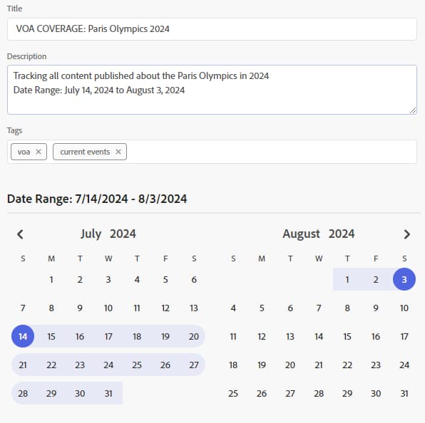 Semelhante ao grupo de conteúdo das Olimpíadas de Paris, seu conteúdo personalizado pode se basear em um evento específico. Isso economizará muito tempo e espaço mental criando um intervalo de datas personalizado associado ao evento. Você pode aplicar esse intervalo de datas personalizado aos painéis no seu projeto do Workspace.