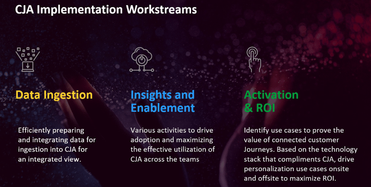 - Nossa meta nesta etapa é capacitar equipes para utilizar com eficiência os insights entre canais do CJA. Uma vez que os dados são assimilados, a próxima fase crítica da implantação é a ativação e a adoção, em que as jornadas do cliente que discutimos no início do plano de implantação do CJA (e os insights revelados por nossos dados assimilados) realmente ganham vida.