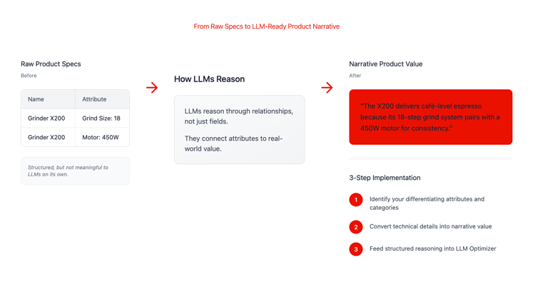 Preparando os dados de catálogo para o raciocínio de LLMs agora, as empresas podem aprimorar a confiança com a qual podem ser recomendadas posteriormente, com uma narrativa mais forte, uma representação mais precisa e um engajamento de qualidade superior em várias superfícies.