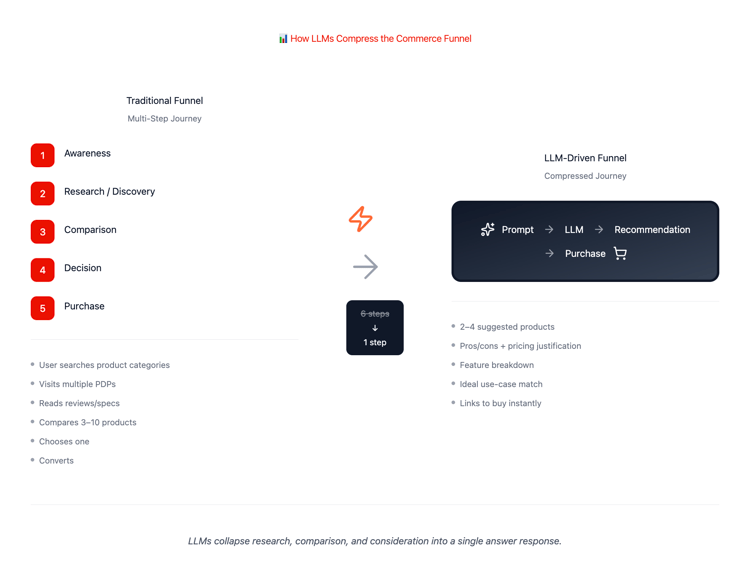 Os clientes esperam cada vez mais respostas diretas, não páginas de opções. Os LLMs resumem milhares de análises, atributos e especificações mais rapidamente que o tempo que um usuário leva para rolar a tela. O modelo torna-se a prateleira. O modelo torna-se o vendedor. O modelo torna-se o primeiro estágio inteiro da jornada de compra.