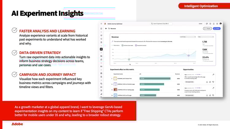 Você gasta uma grande quantidade de tempo analisando experimentos para determinar por que um experimento se saiu da maneira que fez? O agente de experimentação exibe insights automatizados para ajudar você a ver coisas que talvez tenha perdido.