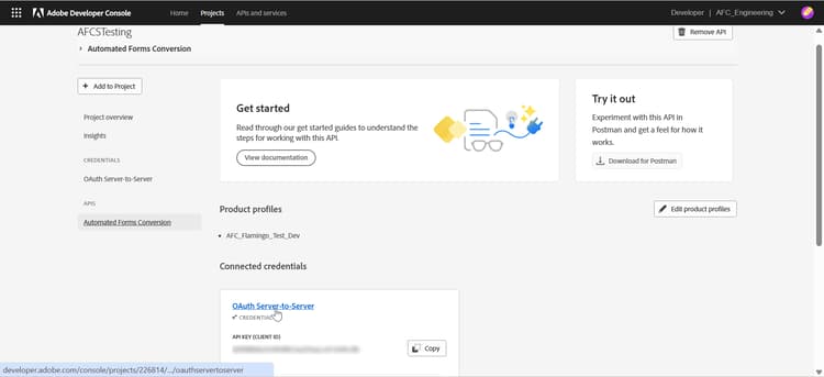 Klicka på OAuth Server-to-Server om du vill visa API-nyckeln, klienthemligheten och annan information som krävs för att ansluta din AEM-instans till tjänsten Automated Forms Conversion (AFCS).