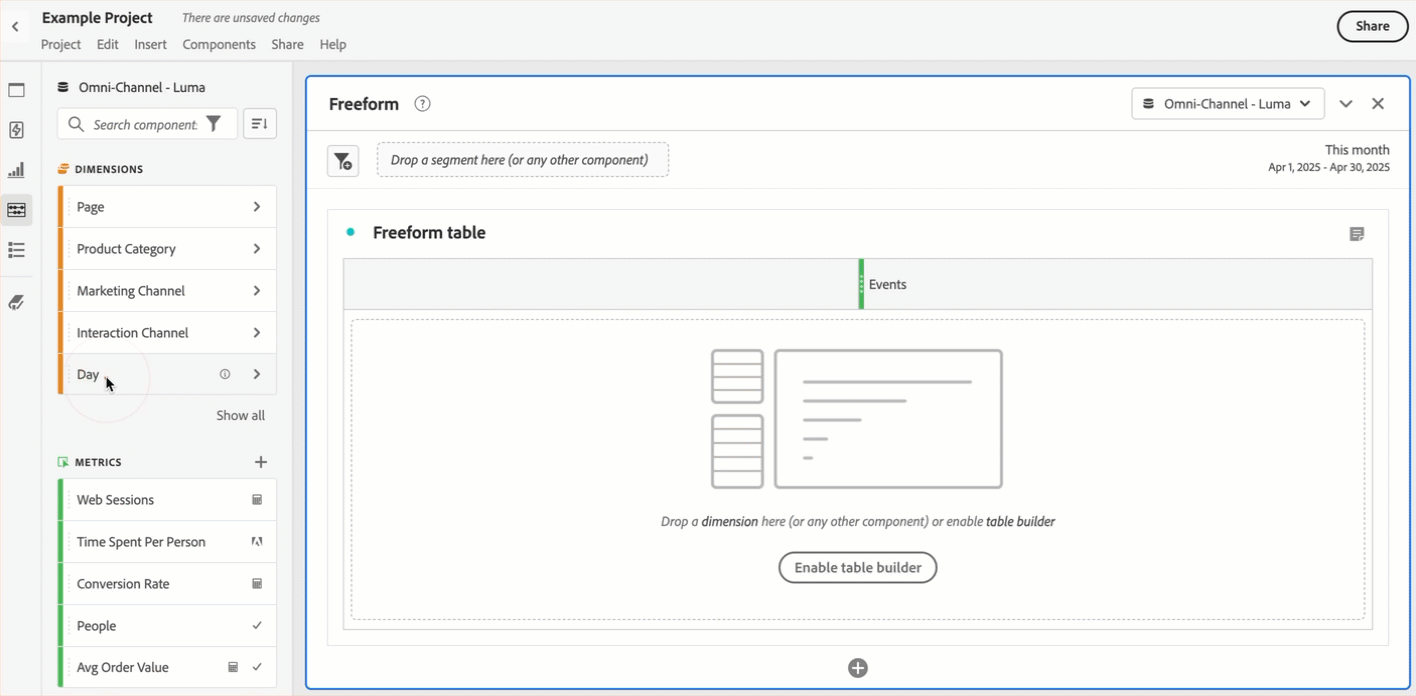 Lägg till en panel eller lägg till en visualisering i projektet i Analysis Workspace. Om du lägger till en komponent i ett tomt projekt skapas redan en frihandsritabellvisualisering åt dig.