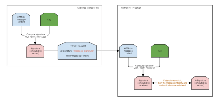 Med hjälp av en privat nyckel som du har angett och som delas med Audience Manager kan vi digitalt signera HTTP(S)-begäranden som skickas mellan IRIS och din HTTP(S)-server. Detta säkerställer att