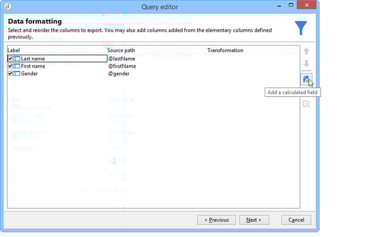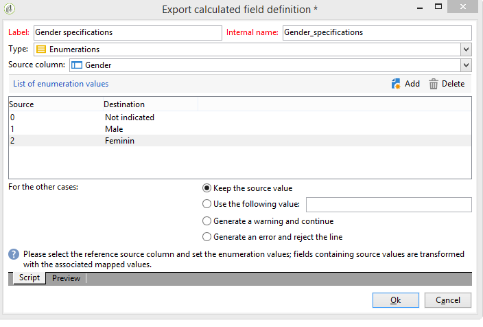 Här vill vi skapa en fråga av typen Enumerations. Det här fältet genererar ytterligare en kolumn i förhandsgranskningsfönstret. Den här kolumnen anger de numeriska värden som returneras som resultat för varje mottagare (0, 1 och 2). Ett kön tilldelas varje värde i den nya kolumnen: "Man" för "1", "Kvinna" för "2" eller "Inte angivet" om värdet är lika med "0".