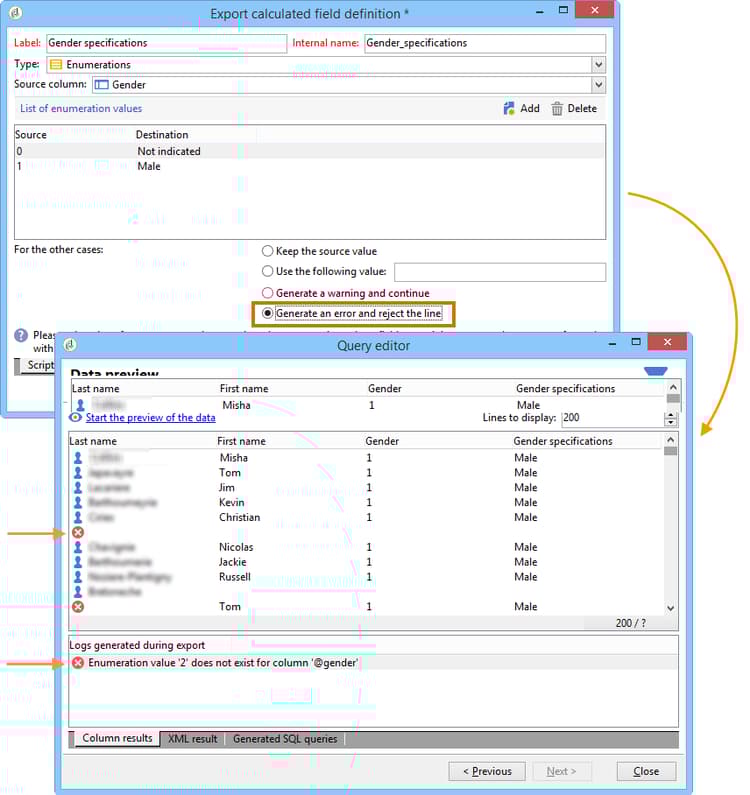 Låt oss ta ett exempel till och säga att uppräkningsvärdet "2" inte anges. Välj funktionen Generate an error and reject the line: alla mottagare av kön (2) genererar avvikelser och den andra informationen på raden (för- och efternamn, osv.) exporteras inte. En fellogg visas i fältet Logs generated during export i förhandsgranskningsfönstret för data. Den här loggen anger att uppräkningsvärdet "2" inte har angetts.