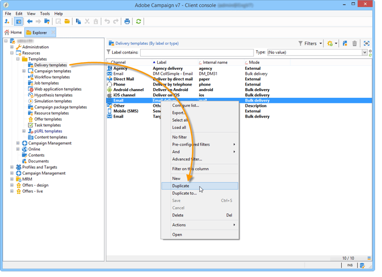 Gå till noden Resources > Templates > Delivery templates i Adobe Campaign Utforskaren och duplicera mallen Email delivery som inte finns i kartongen.