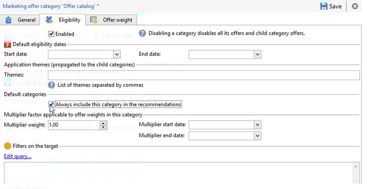 Klicka på fliken Eligibility och kryssa i rutan Always include this category in the recommendations.
