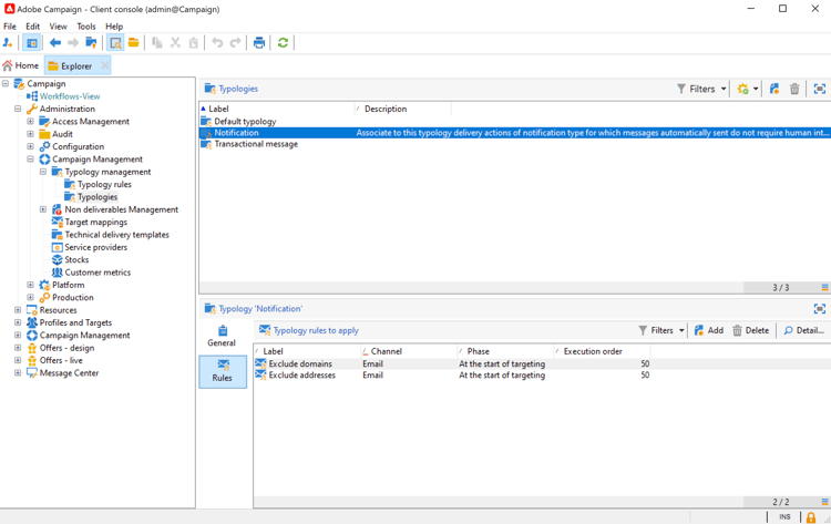 Inbyggda typologiregler och typologier är tillgängliga i mappen Administration > Campaign management > Typology management i Campaign Explorer.