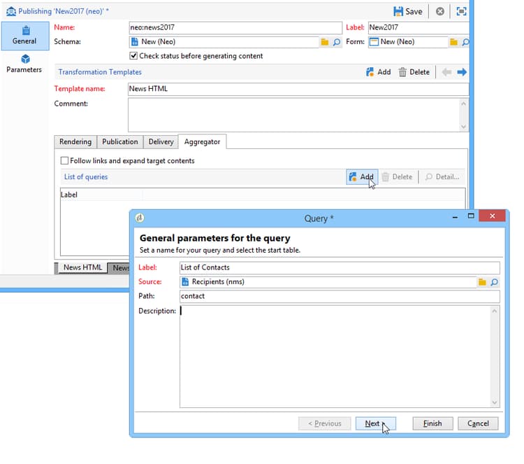 Med aggregatorer kan du utöka innehållet med externa data. Dessa data kommer från generiska frågor eller länkade tabeller.