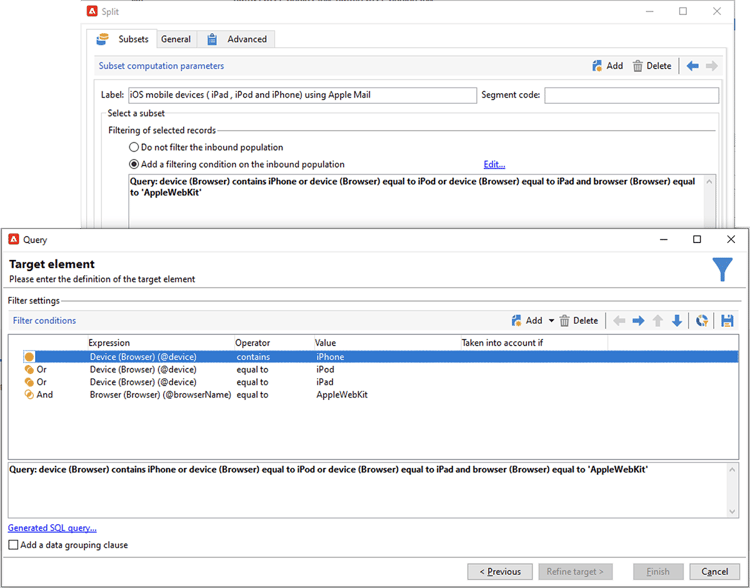 Du kan använda arbetsflöden för att avgöra om en mottagare använder appen Apple Mail. Du kan dela spårningsloggar efter enhet. Du kan till exempel använda frågefilter för att dela upp poster efter iOS-enhet: