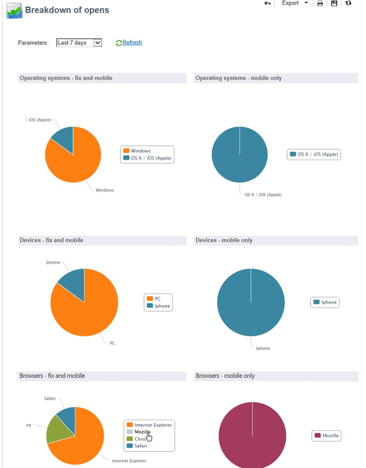 Använd den här rapporten om du vill identifiera hur stor andel e-post som öppnas per operativsystem. Läs mer.