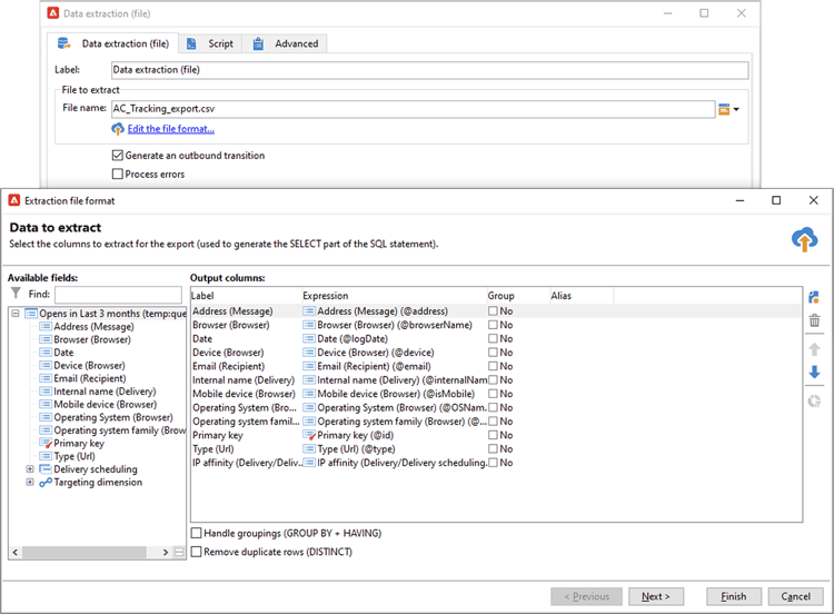 Lägg till en Data extraction (file)-aktivitet. Mappa alla data från frågan till ett extraheringsfilformat.