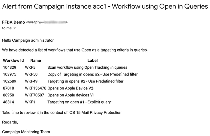 Du kan använda det här exemplet på implementering för att identifiera de arbetsflöden där e-postöppningar används som ett målinriktningskriterium och för att skicka ett meddelande till valfri kampanjoperatör. Du kan använda den här implementeringen för följande syften: