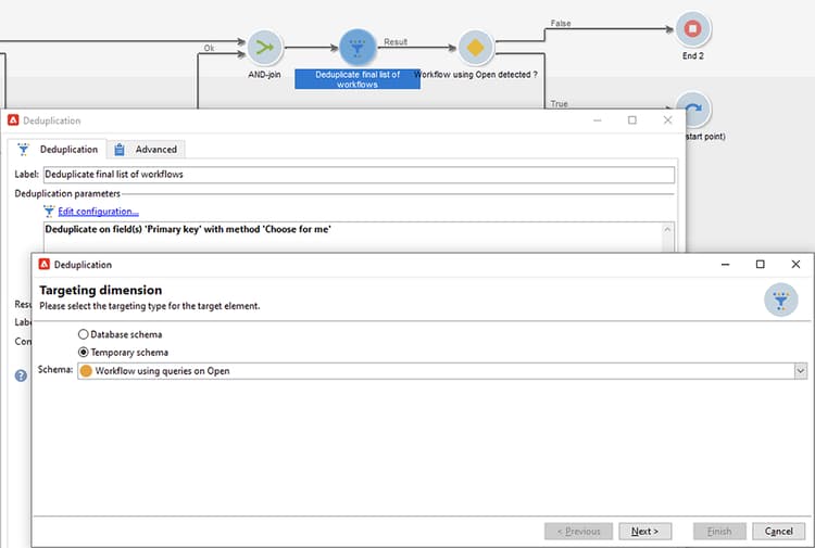 En Deduplication-aktivitet följer varje Split-aktivitet. Aktiviteten Deduplication används för att ta bort dubblette-postadresser.