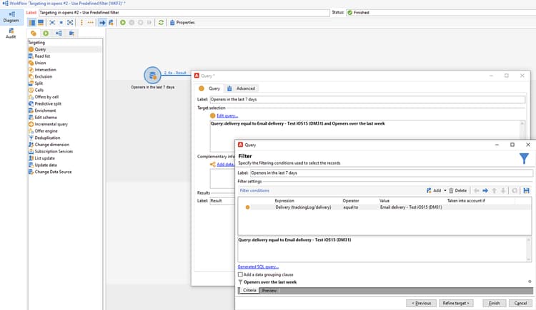 xtk:workflow. Den här aktiviteten används för att hitta, i den aktuella instansen, explicita arbetsflödesfrågor som innehåller e-post som öppnas som ett målinriktningskriterium.