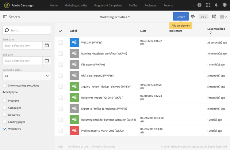 Med listan över marknadsföringsaktiviteter kan du visa alla arbetsflöden och deras status. Mer information finns i Hantera marknadsföringsaktiviteter.