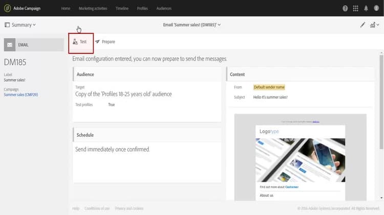 När du har definierat målet och skapat innehållet i ett meddelande måste du förbereda och testa innehållet, personaliseringen, återgivningen och konfigurationen för dina leveranser. På så sätt kan du se till att allt är korrekt innan du skickar meddelandet till huvudmålet. För att göra detta finns det flera funktioner som förhandsgranskning, korrektur, ämnesradstestning via e-post eller e-poståtergivning.