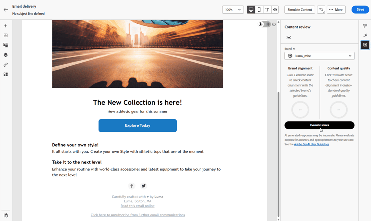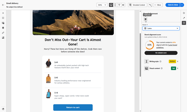 När ditt varumärke har konfigurerats och publicerats kan du bedöma varumärkesjusteringspoängen direkt i din e-postkampanj för att se till att innehållet följer varumärkesriktlinjerna: