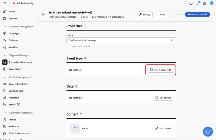 Klicka på knappen Review and publish för att skapa och publicera meddelandet. Utlösarna kan nu initiera att ditt transaktionsmeddelande skickas.