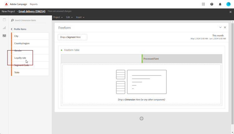 Klicka på Dimensions i kategorin Profile och dra och släpp profildimensionen i frihandstabellen.