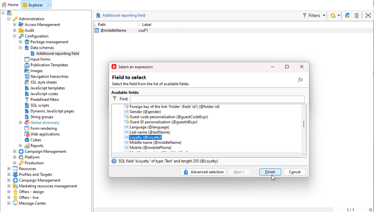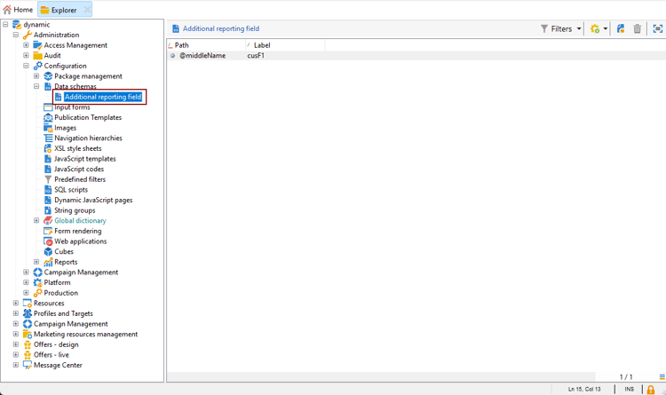Navigera till mappen Administration > Configuration > Data schemas > Additional reporting field i Utforskaren.