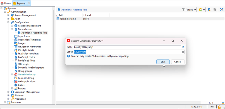 Skriv in dimensionen Label, synlig i dynamisk rapportering, och klicka på Save.