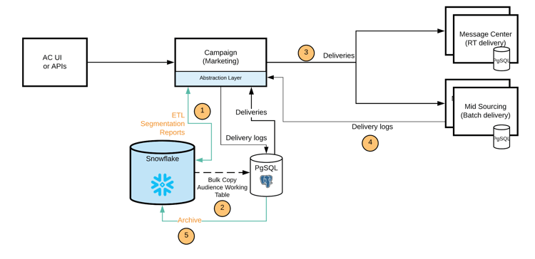 Du kan flytta dina historiska data till Snowflake och sedan minska beroendet av Adobe Campaign ID:n. Denna arkitektur minskar också ditt beroende av PostgreSQL-lagring och prestandagränser. Eftersom mindre data lagras i Campaign-databasen blir prestandan bättre och underhållsuppgifterna utförs snabbare. -