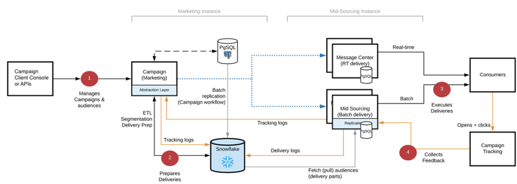 I en Enterprise (FFDA)-distribution fungerar Adobe Campaign v8 med två databaser: en lokal Campaign-databas för meddelanden i realtid i användargränssnittet och enhetliga frågor och skrivningar via API:er samt en Cloud Snowflake-databas för kampanjkörning, gruppfrågor och arbetsflödeskörning.