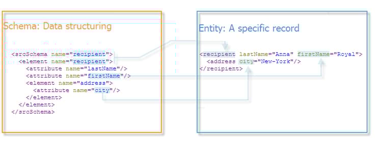 <element>-taggarna definierar namnen på entitetselementen. <attribute> taggar i schemat definierar namnen på attributen i <element> -taggarna som de har länkats till.