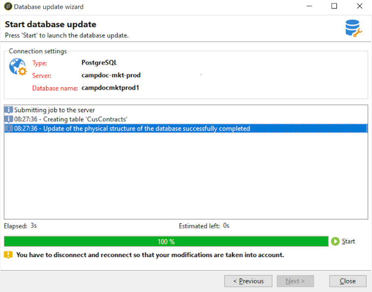 Om du vill använda ändringarna i scheman startar du guiden Databasuppdatering. Den här assistenten är tillgänglig via Tools > Advanced > Update database structure. Den kontrollerar om databasens fysiska struktur matchar dess logiska beskrivning och kör SQL-uppdateringsskripten.