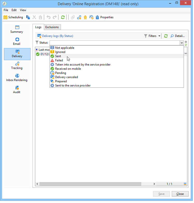 Fliken Delivery ger en historik över förekomster i den här leveransen. Den innehåller leveransloggarna, dvs. en lista över skickade meddelanden och deras status samt tillhörande meddelanden.
