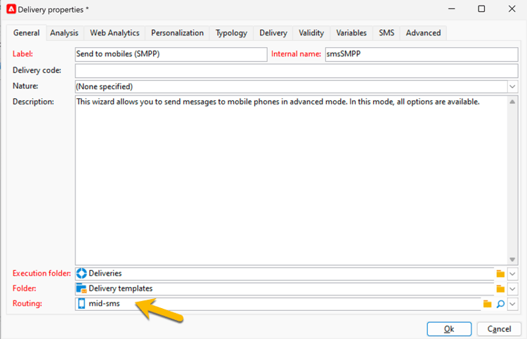 På fliken General i Routing väljer du ett externt SMPP-konto.