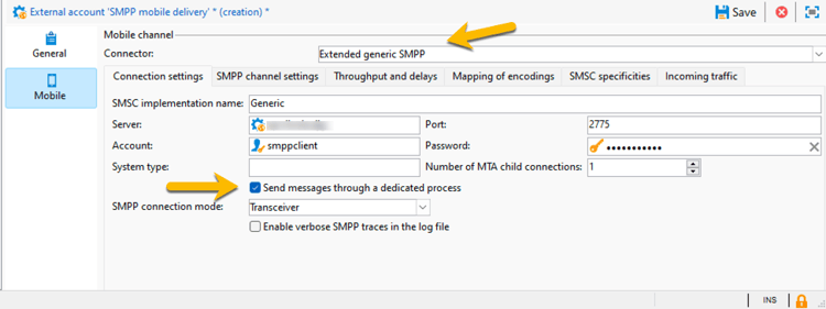 På fliken Mobile håller du Extended generic SMPP i listrutan Connector.