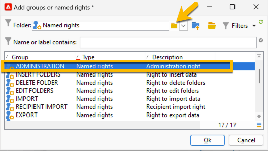 I det nya fönstret som öppnas väljer du Named rights i listan Folder och väljer ADMINISTRATION i den högra listan. -