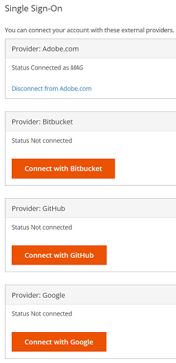 1. Expandera avsnittet Enkel inloggning i https://accounts.magento.cloud/user. Klicka på Koppla från Adobe.com för att koppla från.
