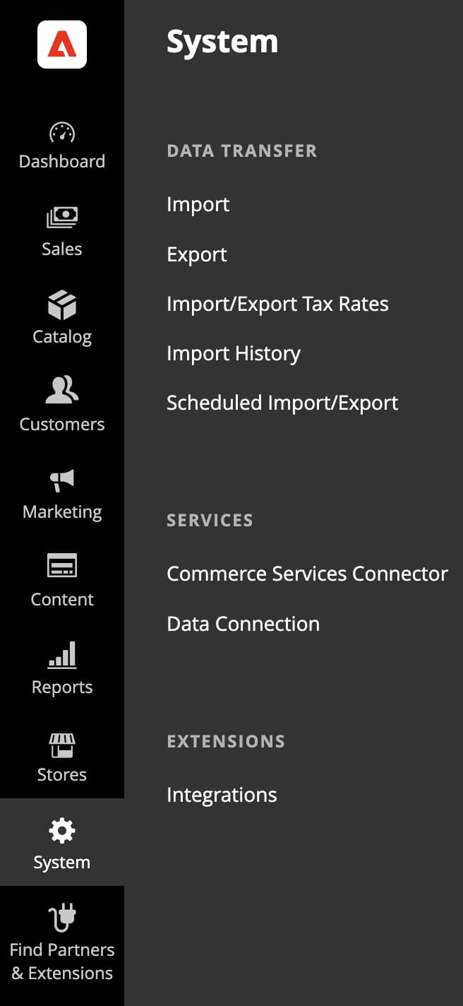 Tillägget Data Connection är tillgängligt från Adobe Marketplace. När du installerar det här tillägget från serverns kommandorad ansluts det till din Adobe Commerce-installation som en tjänst. När processen är klar visas Data Connection och Commerce Services Connector på menyn System under Tjänster i Commerce Admin.
