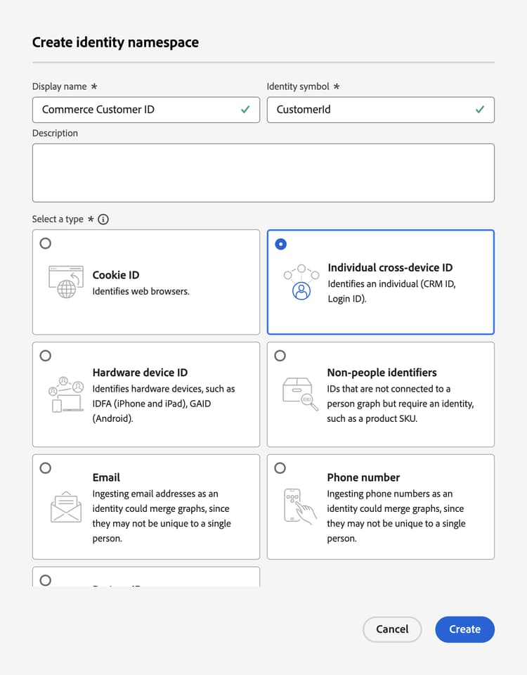 Klicka på Create. Ett anpassat namnutrymme används av tjänsten för enhetlig profil för sammanfogning av profilfragment.