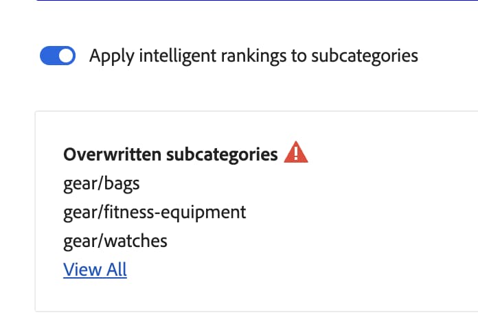 Om du använder en smart rankning för en kategori och aktiverar alternativet Använd smart rankning för underkategorier, skrivs alla intelligenta rankningar som redan används för underkategorierna över.