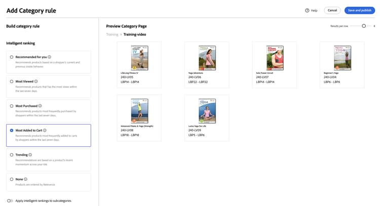 Intelligent rankning använder beteendedataanalys i bakgrunden av Adobe AI för att sortera alla produkter inom valda kategorier efter en viss algoritm. När man väl har valt en Intelligent rankning förväntas produktordningen förändras över tiden eftersom de underliggande uppgifterna analyseras om kontinuerligt av Adobe AI. De ledande trendprodukterna kommer till exempel att ändras automatiskt över tid när kundernas preferenser förändras.