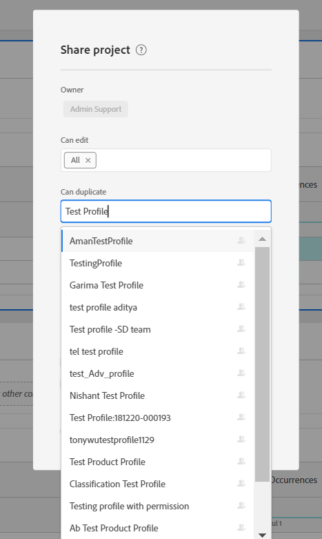 Obs! Om alla behörigheter som har tilldelats produktprofilen X återkallas i Admin Console kommer produktprofilen X fortfarande att vara tillgänglig i listrutan för delningsprojekt.
