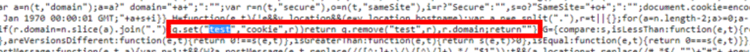 I VisitorAPI.js finns en cookie med namnet"test". Du kanske undrar vad det här används till. Den skrivs helt enkelt till sidan för att verifiera att cookies kan skrivas på sidan och sedan tas bort direkt.