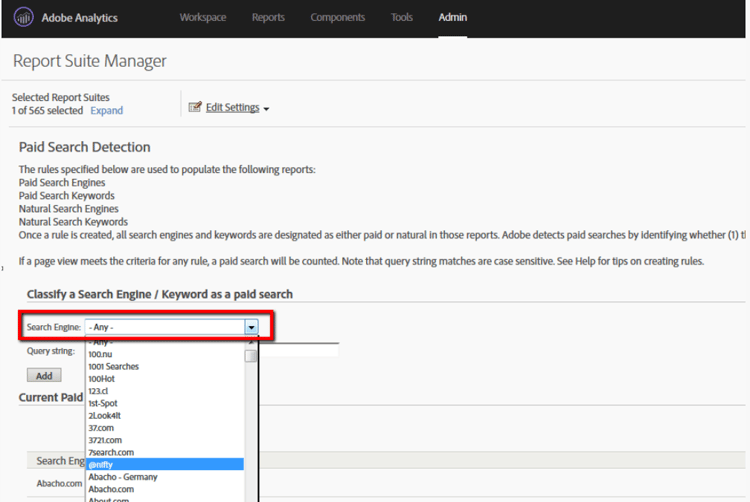 Du kan snabbt hitta sökmotorerna som registrerats i Adobe Analytics på menyn Betalsökningsidentifiering: