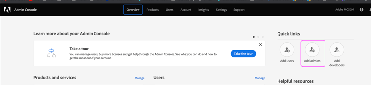 - Navigera till Admin Console och välj Lägg till administratörer på snabblänksmenyn: