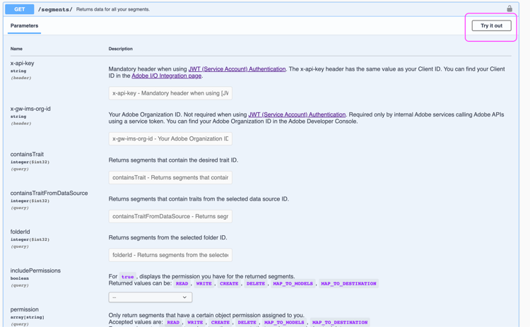 Slutligen kan du göra API-begäranden med åtkomsttoken som hämtades i föregående steg. Anrop kan göras från vilken API-plattform som helst, till exempel Postman, direkt via cURL-kommandon, eller till och med från API-dokumentationssidan: https://bank.demdex.com/portal/swagger/index.html#/