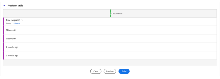 I den här artikeln behandlas sorteringsproblem med Dimensioner för datumintervall i Adobe Analytics Customer Journey Analytics. Du kan lösa problemet genom att använda funktionen Tabellbyggaren för att manuellt ändra ordning på dimensionerna, vilket möjliggör anpassad sortering för exempelvis Den här månaden > förra månaden > 2 månader sedan > 3 månader sedan.